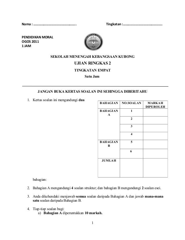 Soalan Pendidikan Moral Ujian Ringkas 26082011 2011 New via www.slideshare.net